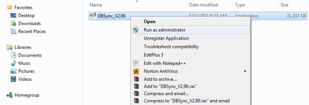 - Go to the Download folder and start the installation by Right Click ? Run as Administrator on the "DBSync_V2.90.exe" file.