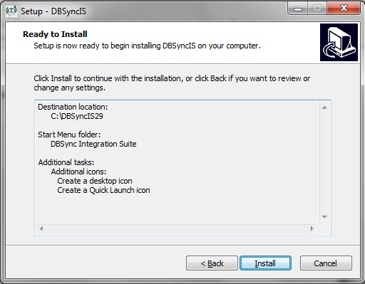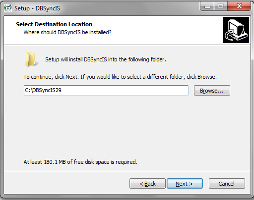 - On Select Destination Location default is C:\ DBSyncIS29, If you want you can select any other folder by clicking browse and click on Next.