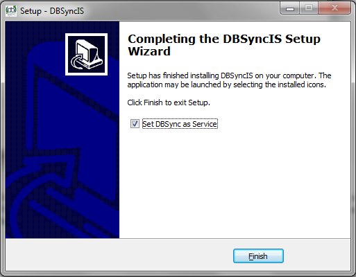 - Once the installation process is done you will be presented with a window with an option to set DBSync as service. If you wish to set it as a service, check the Check box "Set DBSync as Service" and click on Finish button.