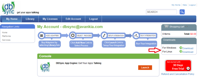 - After logging in, go to My Home and click on Launch button in console area of the page to launch DBSync Console. Your should be re-directed to the DBSync console page.