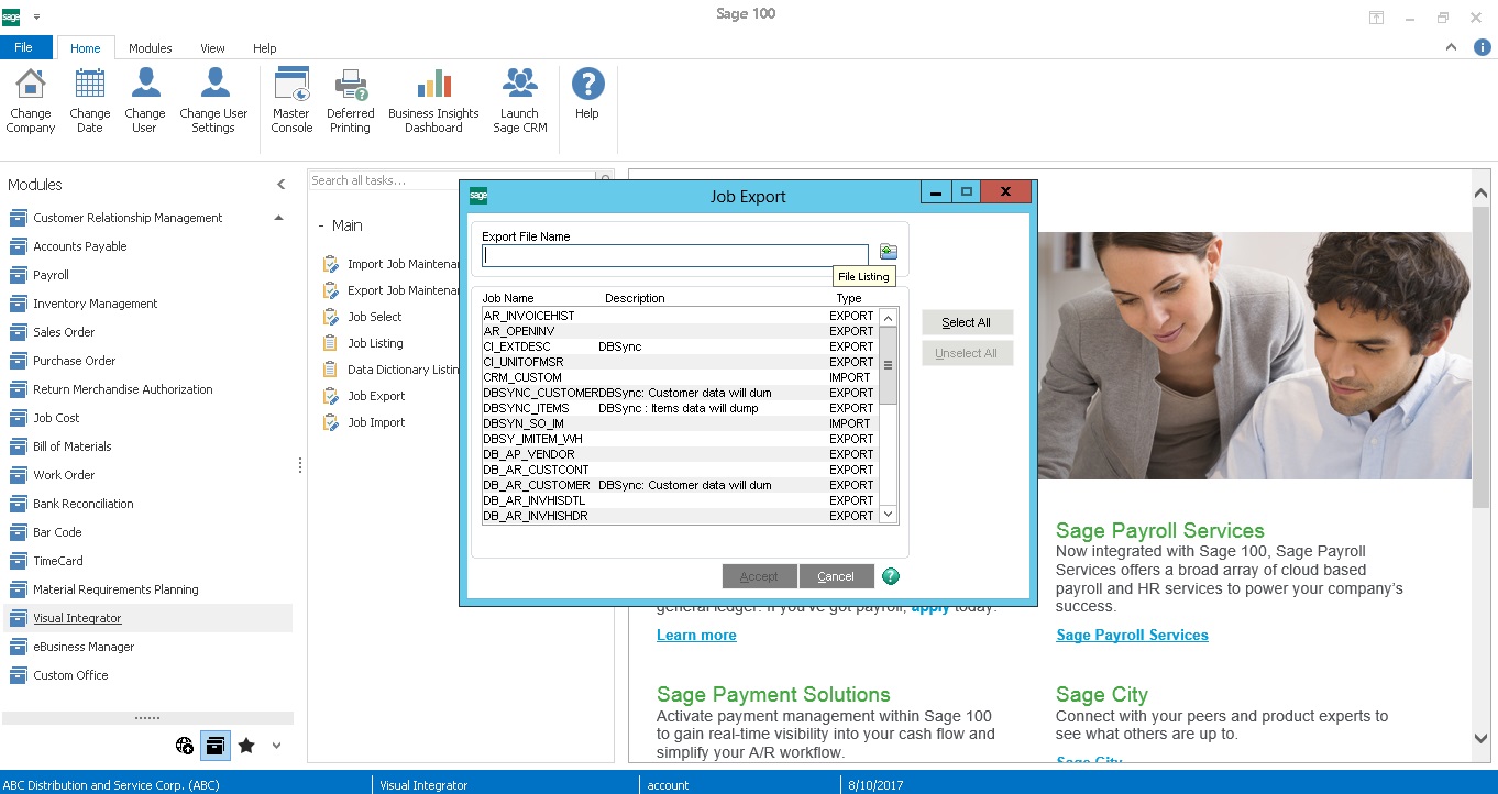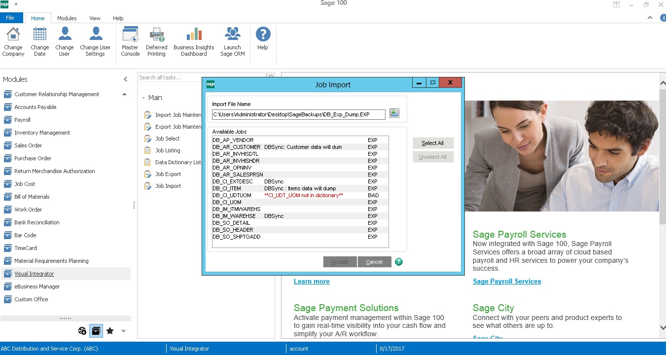 The data from Sage 100 is fetched through a mechanism within Sage 100 - referred to as a Visual Integrator. We have created export jobs to fetch data from various tables of Sage 100. Instead of creating the relevant export and import jobs, we have created the jobs dump file. You can restore the file in your Sage 100 instance.