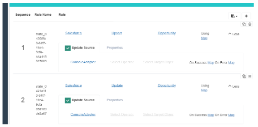In Salesforce upsert and update rule, the status writer should be selected as Console adapter on success need to mapped as VALUE("newid") on error map can be mapped as "error in creating opportunity"