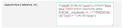 IF(ISEMPTY(VALUE("newid")),LOOKUP("Salesforce","select id from Opportunity where AVSFQB__Quickbooks_Id__c='"+PARENTVALUE("TxnID")+"'"),VALUE("newid"))