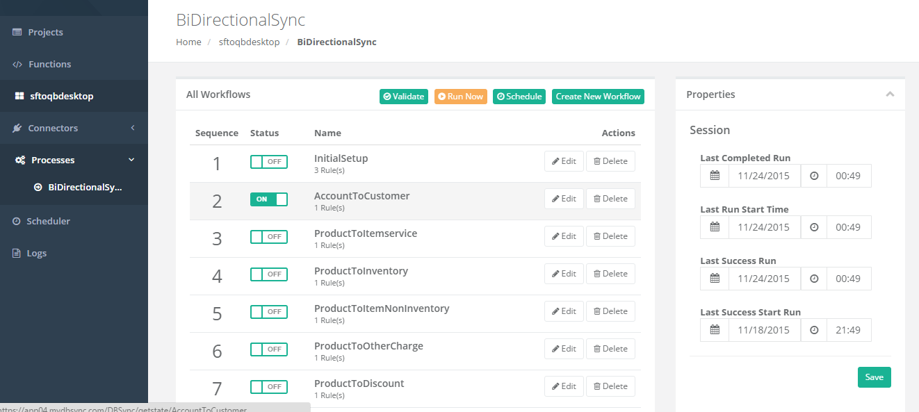 The status can be set to, 'On or Off'. An on status will enable a workflow to execute - either by schedule or by Run Now action. An Off status will disable a workflow from executing. Properties can also be set by selecting appropriate fields and save.