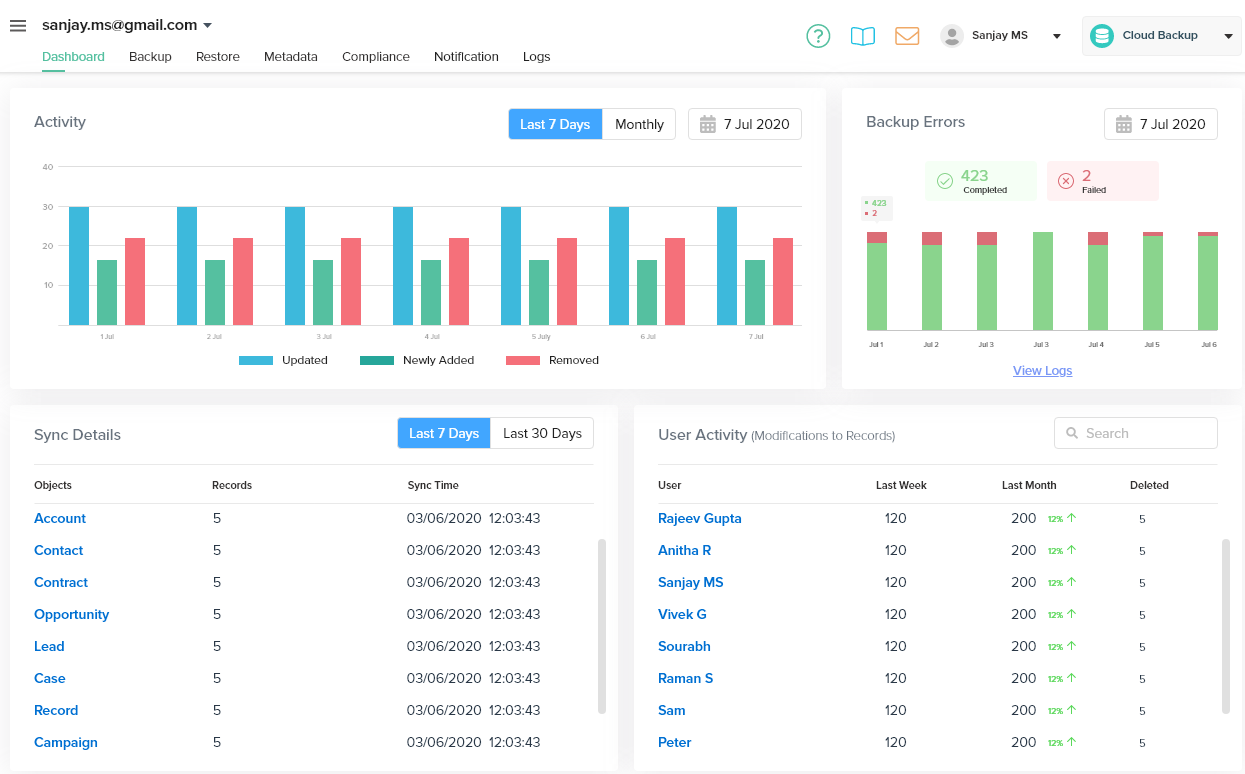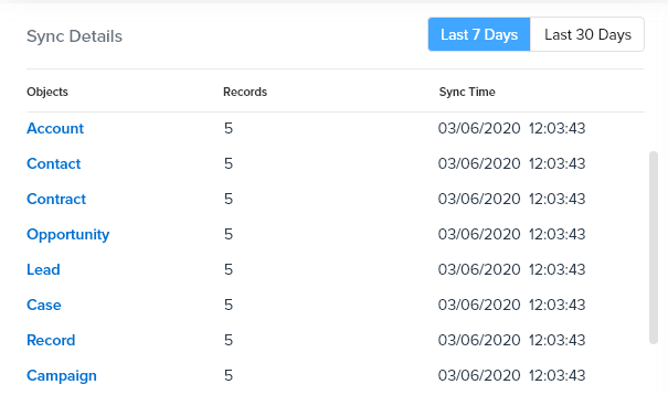 - Sync Details - The various details of the sync including, records, objects and time take can be viewed under Sync details.