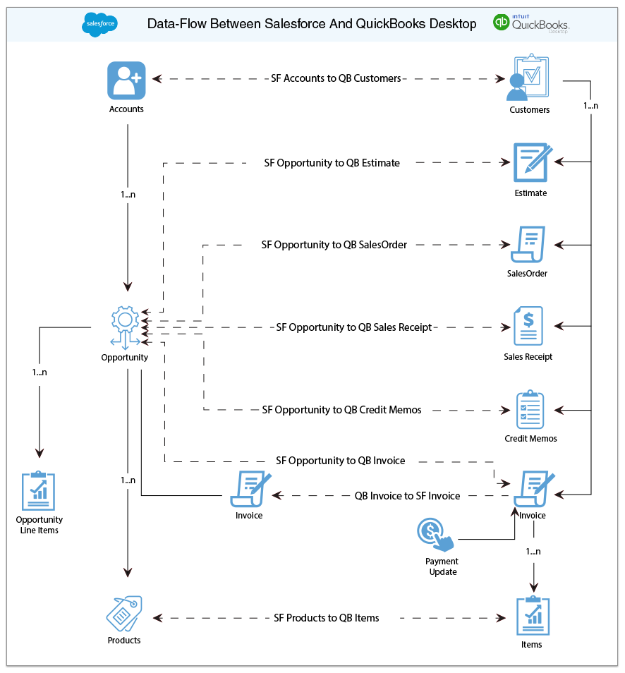 This solution is used to to integrate Salesforce Accounts / Contacts, Products, Opportunity with QuickBooks Customers, Items, Estimate, Sales Order, Invoice, Sales Receipt & Credit Memo. In the following table the field to field mappings of objects that are part of this package are detailed out.
