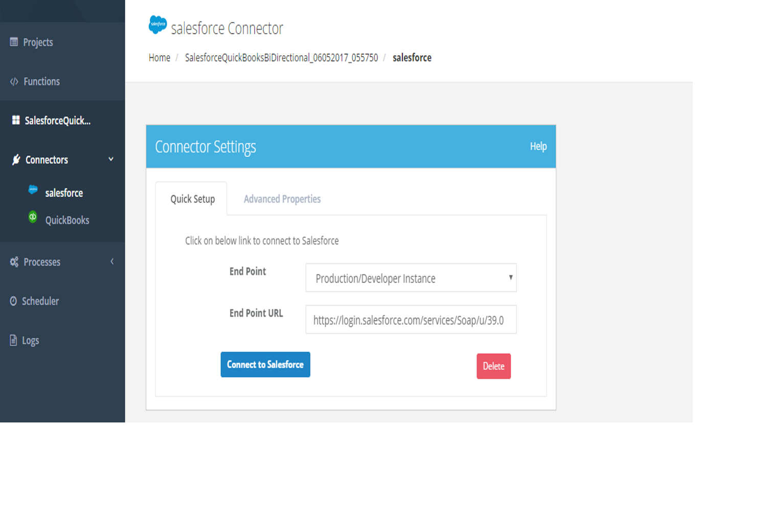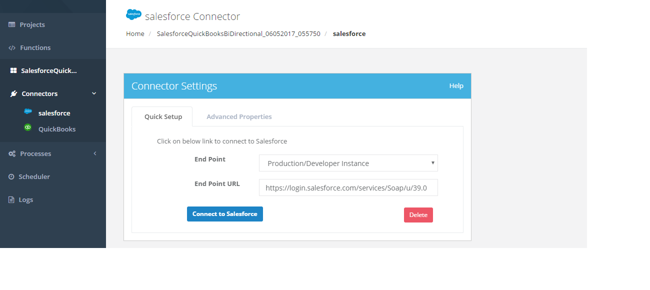 The Salesforce connector can be connected to Salesforce by OAUTH authentication, user can use the "Quick Setup" tab , Hit the "Connect to Salesforce" button and input his user credentials (Email Id, password ) on the Salesforce popup to authenticate his credentials. The other way to connect to Salesforce instance is to use "Advanced Properties" and to input the necessary parameters to connect with the desired Salesforce instance.
