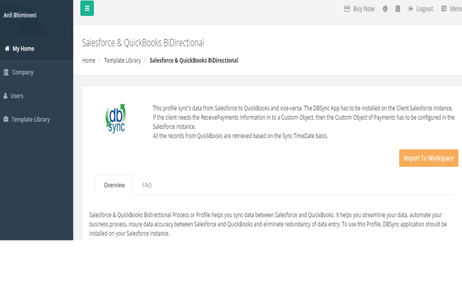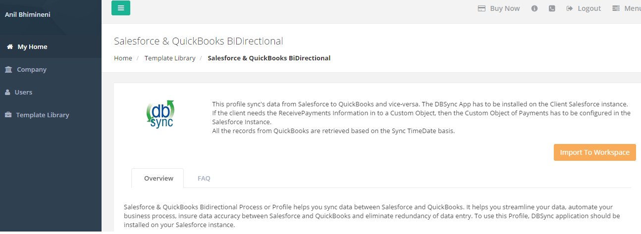 - On the right hand corner click on "Import To Workspace", that will add the template to your DBSync user instance and land the user on the connector listing page.