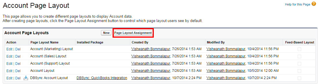 - Go to Salesforce Setup > Customize > Accounts > Page Layouts. This will show the list of available Page Layouts for Accounts Object. Click on Page Layout Assignment.
