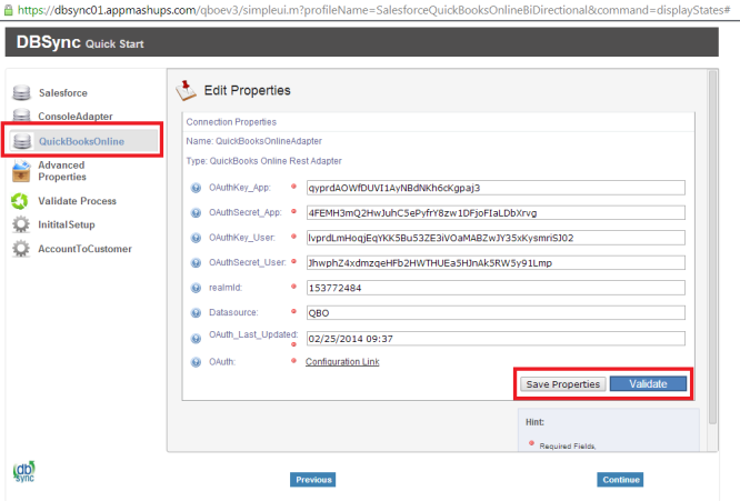 - Go to Advanced Properties enter the details Application OAuth Key, Application OAuth Secret, User OAuth Key, User OAuth Secret, Realm Id, Datasource, OAuth Last Updated, OAuth URL.