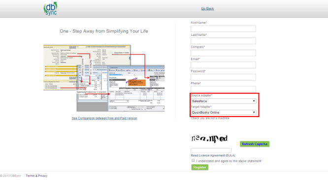 - Go to www.mydbsync.com & register for Free Trial. Ensure that Source & Target Adapters are Salesforce & QuickBooks Online respectively.