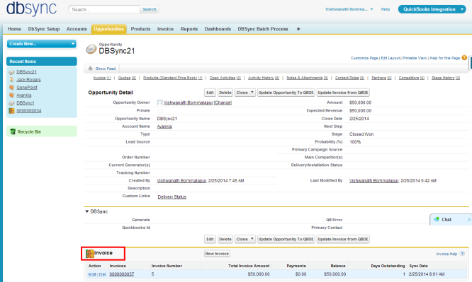 - It is mandatory that SF Opportunity (to be integrated with QBOE Invoice) is associated with the respective SF Account & also should have Products with Standard Price Book attached to it for DBSync to invoke integration.